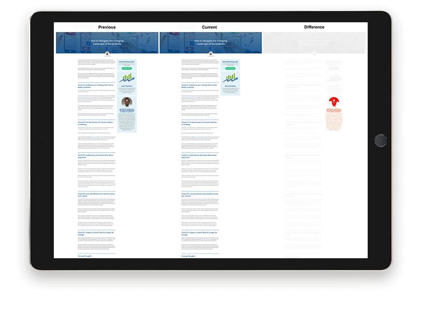 Automated visual regression testing service ensures that all of your pages are looking as expected by catching problems before your prospects or clients experience them.